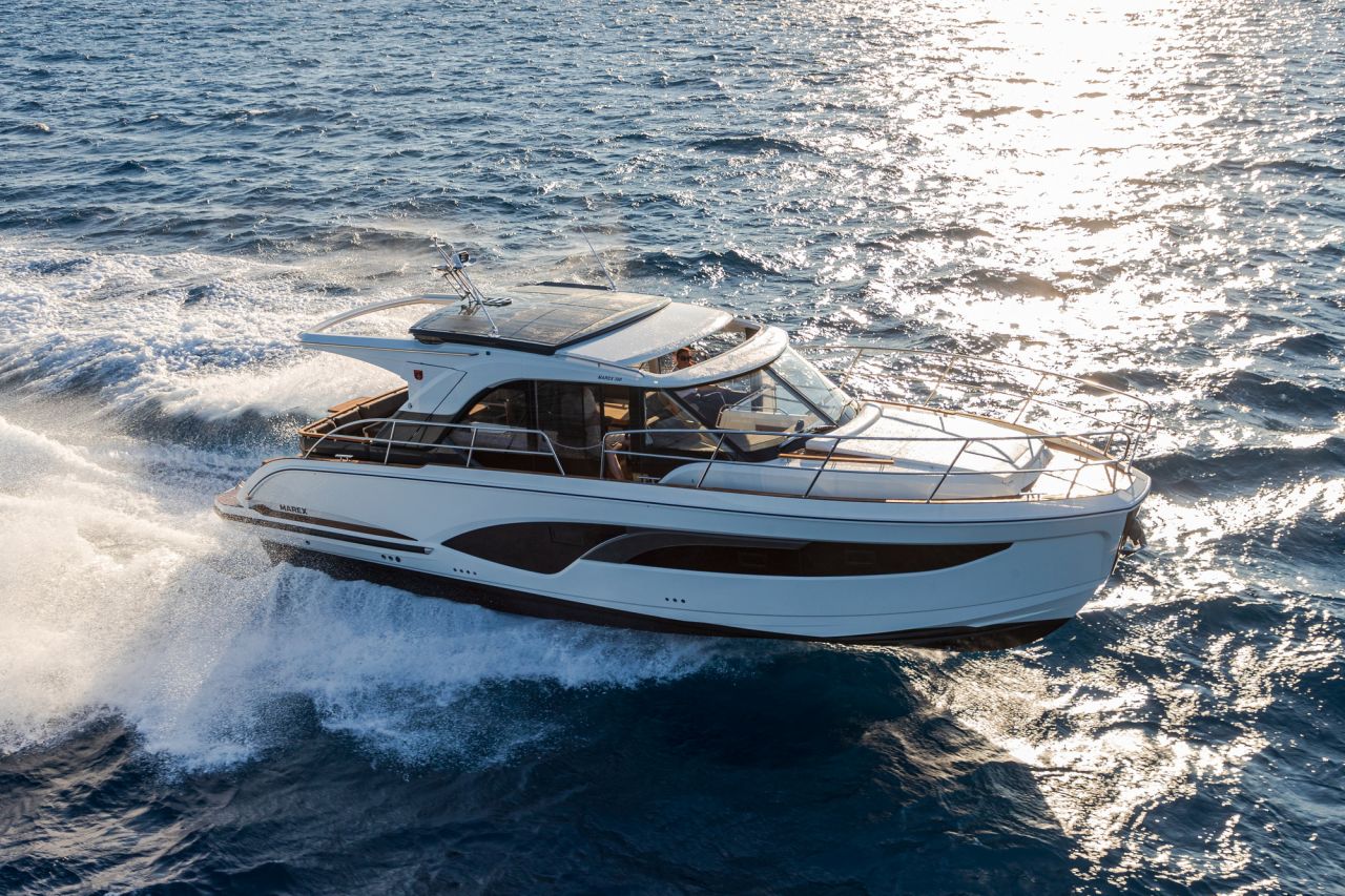 The Marex signature enclosure, the Smart Canopy System, remains a highlight. The side curtains can be deployed in seconds, and together with two sliding roofs, the boat can be adapted to various weather conditions.